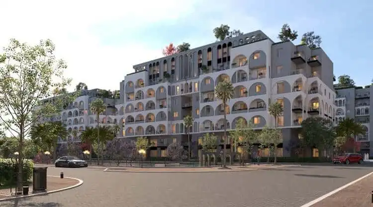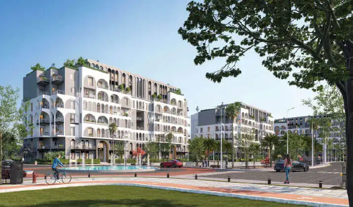 The architectural design pulls from Italian-inspired contemporary styles—clean lines, symmetrical facades, emphasis on natural light. The buildings aren’t particularly tall by New Capital standards, which keeps the overall feel more open.