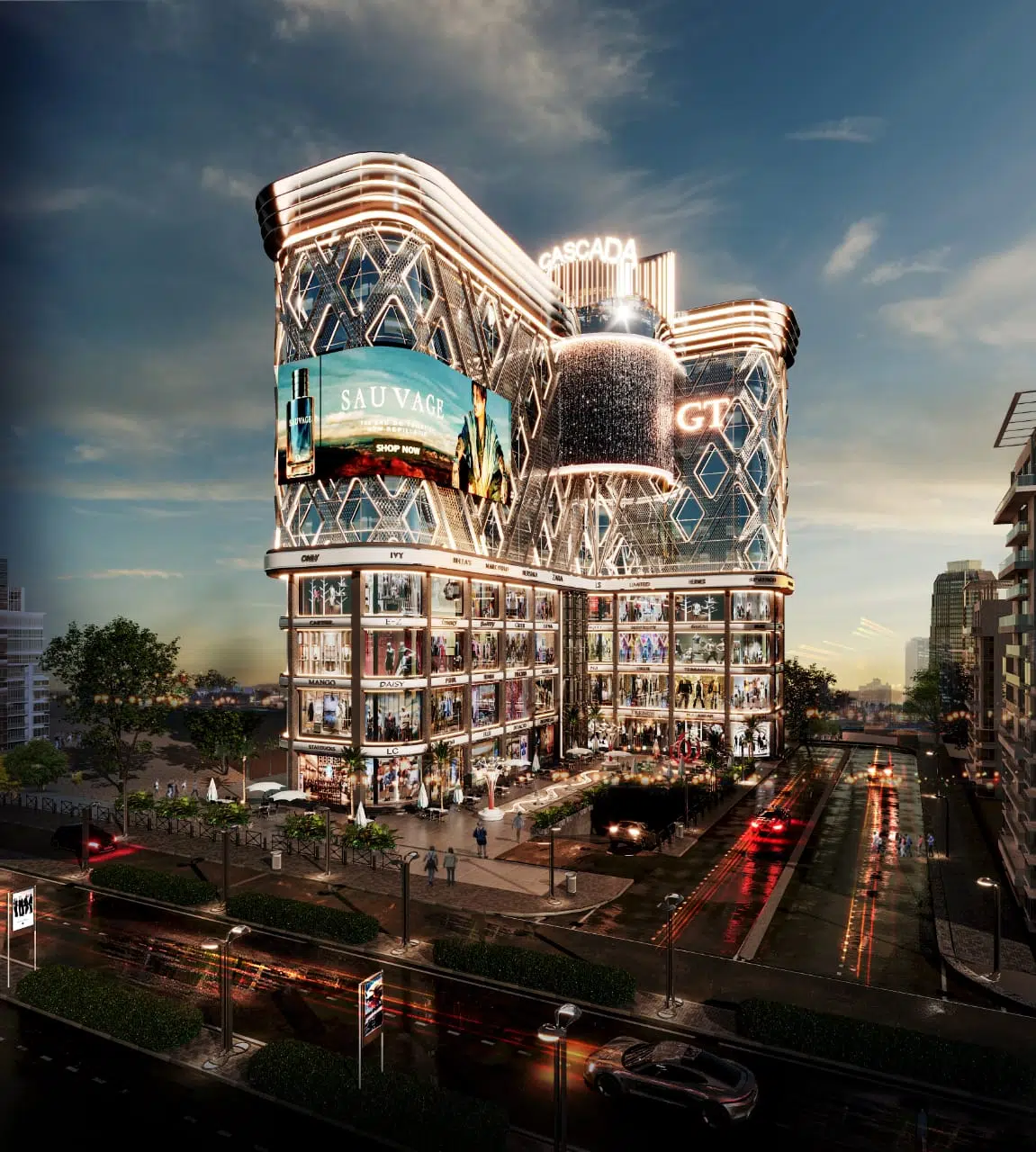 Golden Town Developments positioned Cascada Mall New Capital in Downtown’s MU2/79 plot, right next to the Monorail Station. The project mixes retail shops, administrative offices, and hotel apartments across eleven floors, with payment plans stretching to ten years and optional guaranteed lease arrangements.
