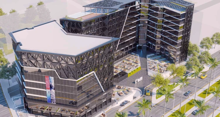 The 5,500-square-meter site is split into two buildings. Building A mixes commercial and medical units. Building B holds administrative offices plus a few extras like a rooftop café and gym. Ground and first floors are retail. Floors one through five are medical. Sixth and seventh floors are offices.