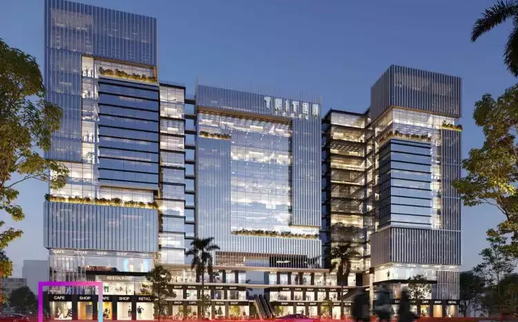 Triton Tower follows a modern commercial tower design with glass facades and panoramic elevators. The architectural approach prioritizes function over decoration, which is typical for business-focused developments. The building includes escalators and elevators for vertical movement across 13 floors, with automated parking systems in the basement to maximize space efficiency.